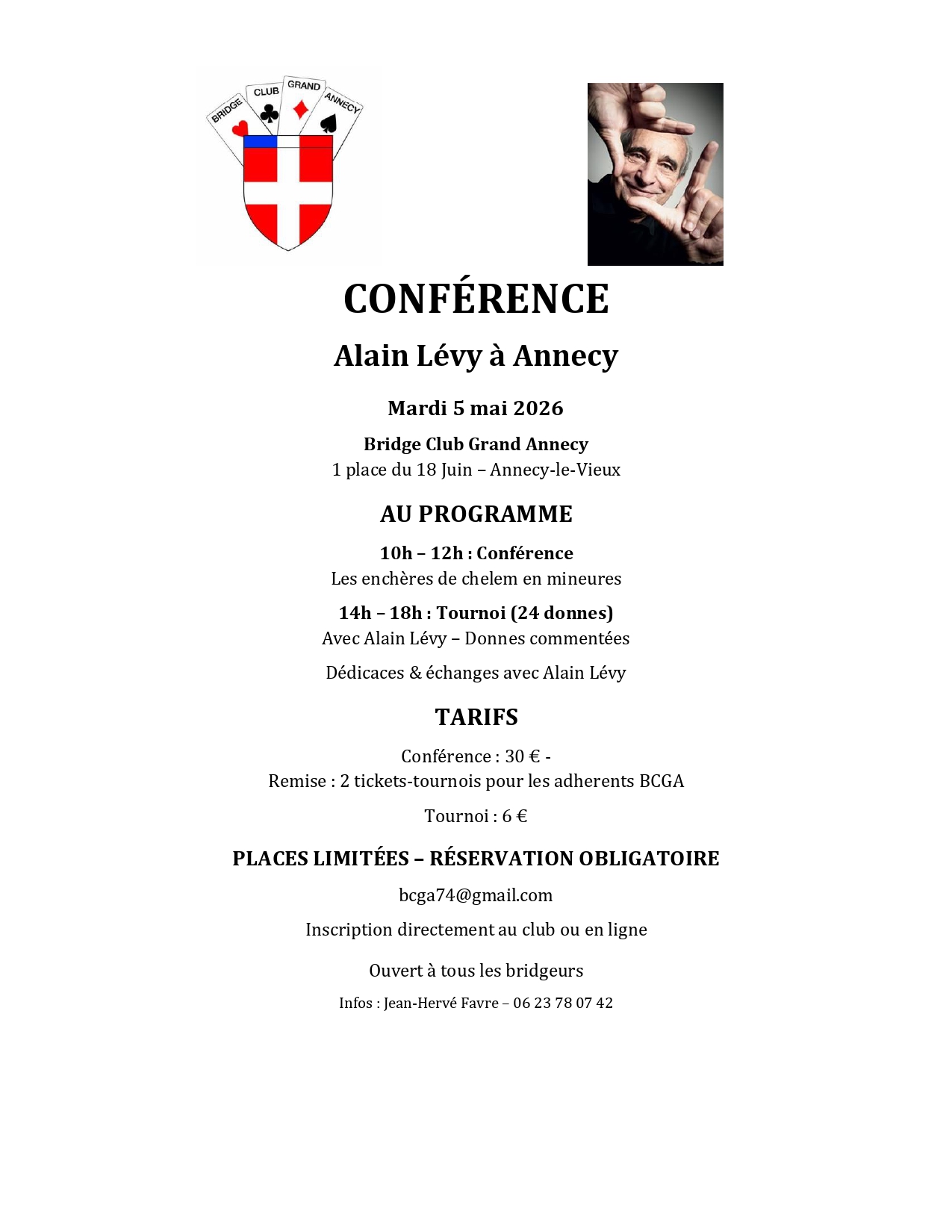 o 14h-18h : Tournoi 24 donnes avec participation de Alain Lévy – 10 donnes d’application commentées