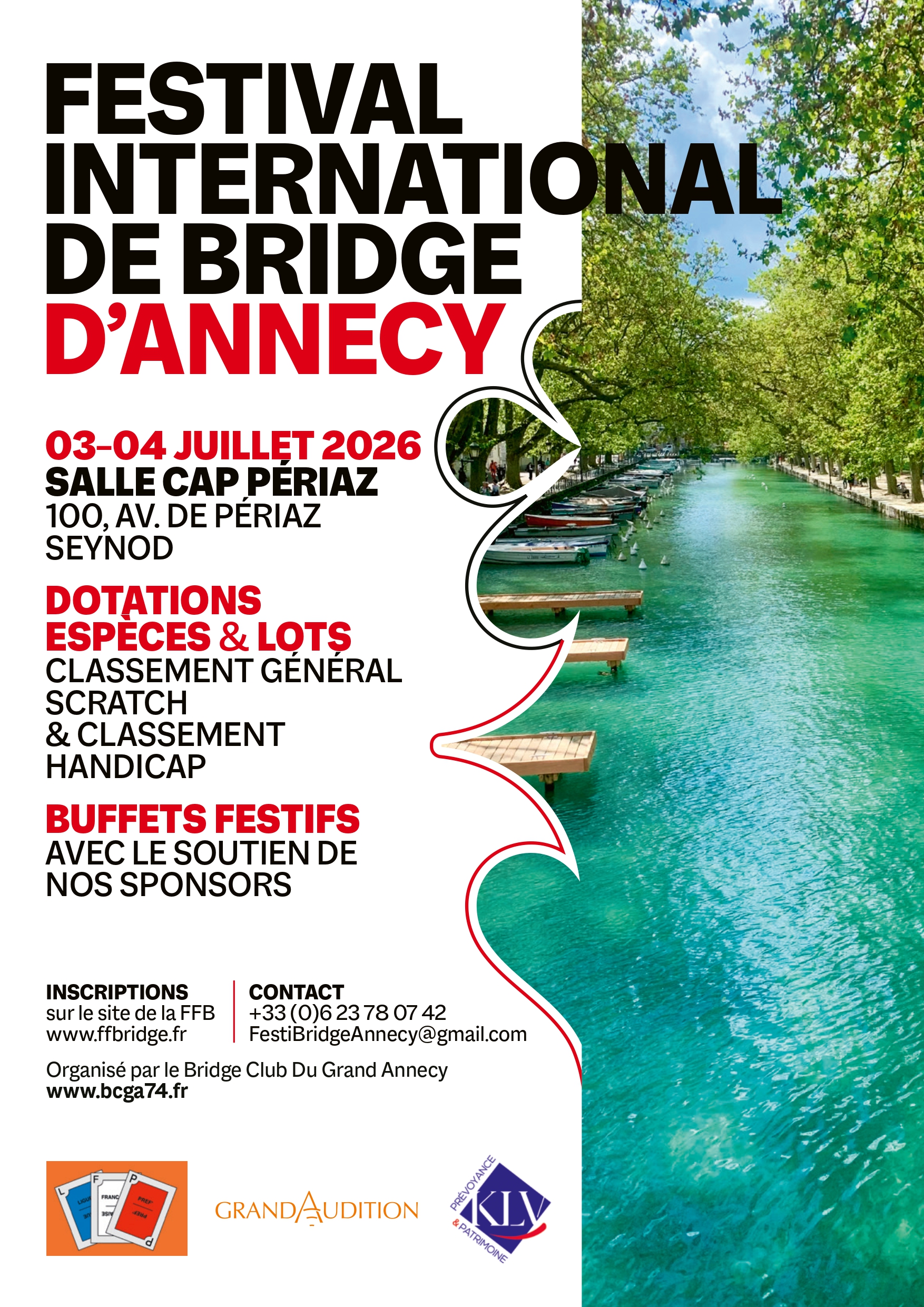 INFO ! Participez au Festi’Annecy sur FunBridge, du 22 au 24 Mai 2026, il s’agit d’un tournoi homologué FFB avec 10 invitations au FIBA à gagner (5 au classement scratch, 5 par tirage au sort). La liste des gagnants sera publiée ici.