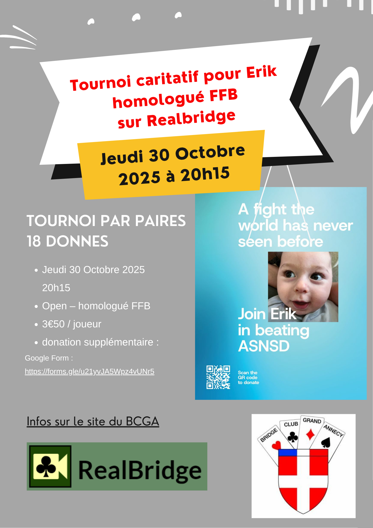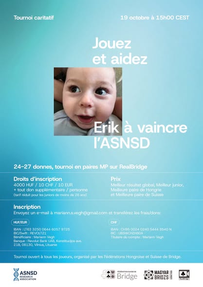 Un tournoi caritatif homologué FFB est organisé le Jeudi 30/10 20h15 sur la plateforme Realbridge pour aider la recherche et aider ERIK, le fils de Mariann Vegh et Balacsz Karancsi (jeunes joueurs de bridge Suisse-Hongrois, autant talentueux que sympathiques) à combattre sa maladie ultra-rare ASNSD (Déficit en asparagine synthétase, cliquez sur l’article sur BridgeWinners).